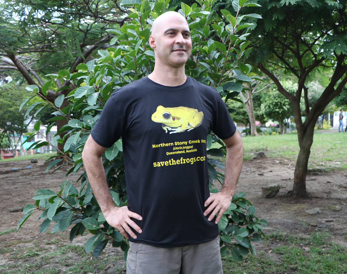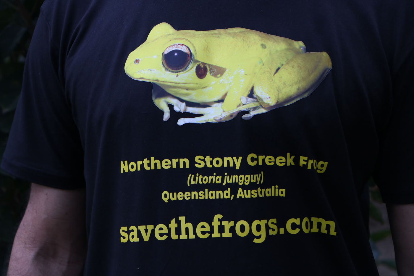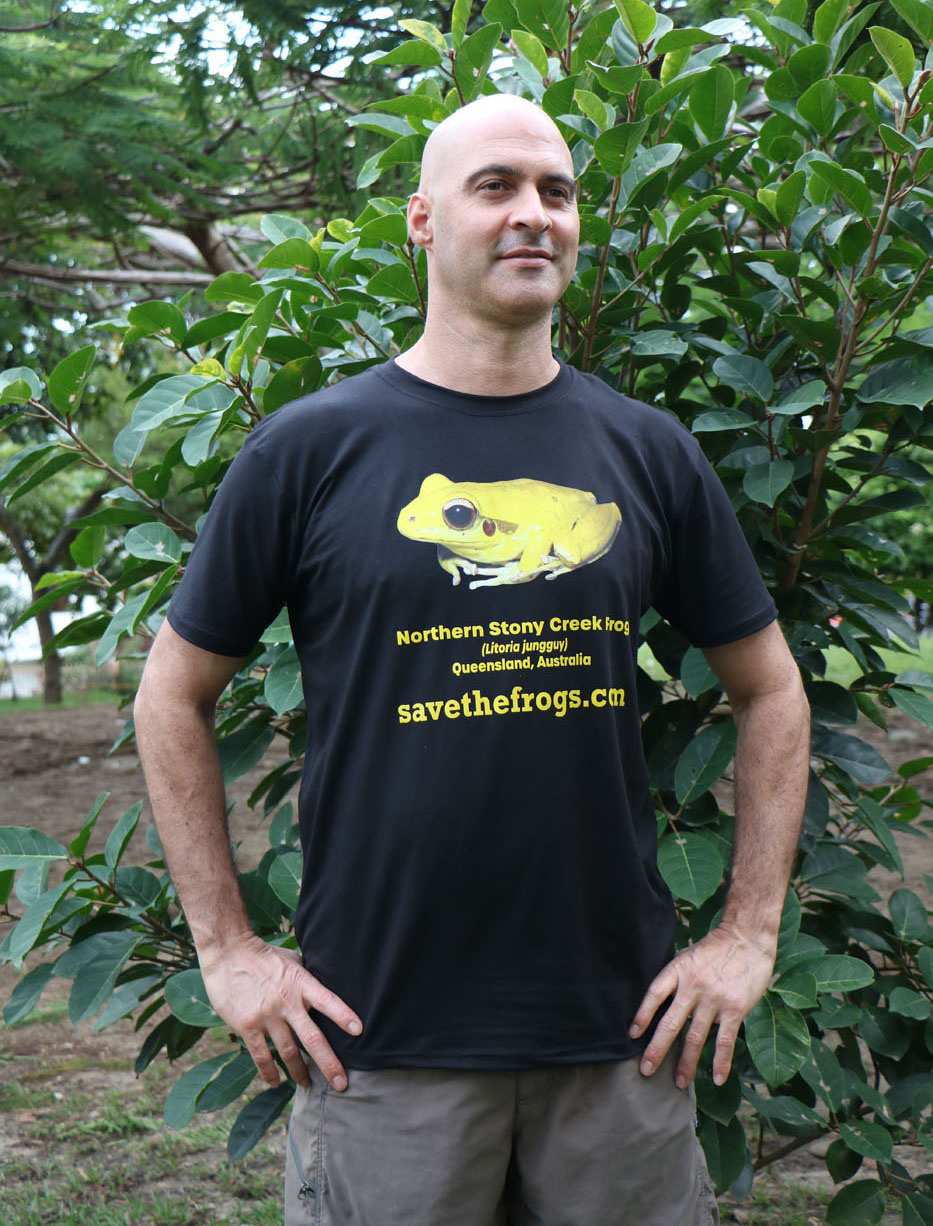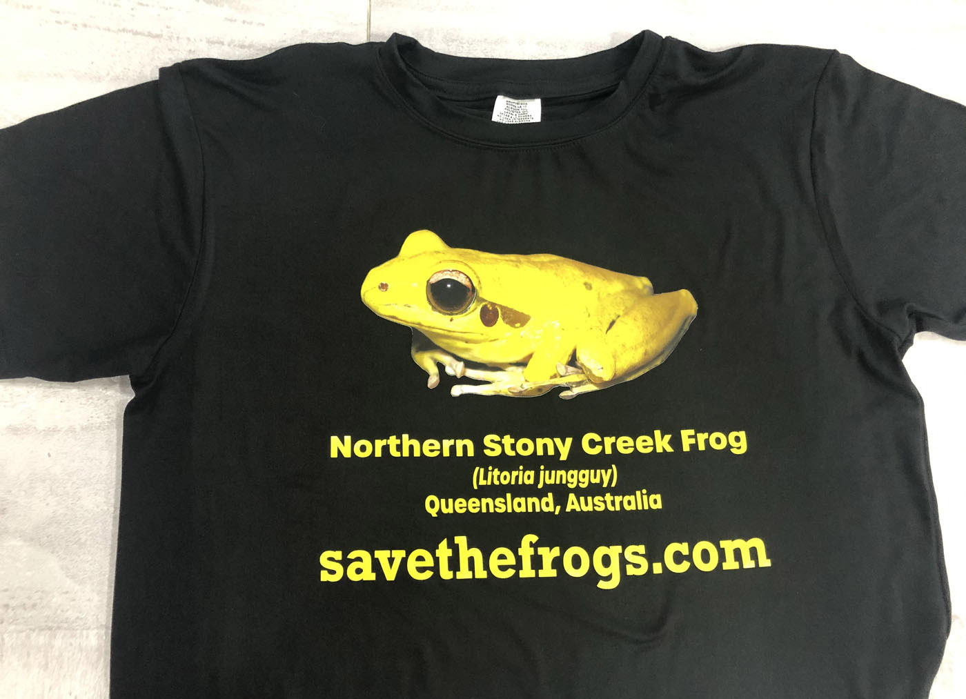 This colorful shirt features the Northern Stony Creek Frog (Litoria jungguy), a native of northeastern Queensland, Australia. Be the only person on your block with a yellow frog t-shirt! Photo taken by SAVE THE FROGS! Founder Dr. Kerry Kriger. 100% of proceeds go to SAVE THE FROGS! worldwide amphibian conservation efforts.